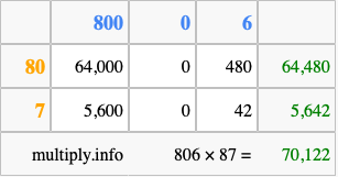 Finally, we add up all the sums we found in step 3 to get our final answer to 806 times 87.