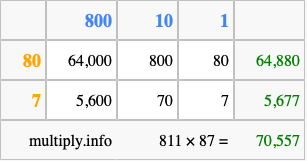 Finally, we add up all the sums we found in step 3 to get our final answer to 811 times 87.