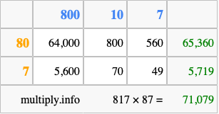 Finally, we add up all the sums we found in step 3 to get our final answer to 817 times 87.