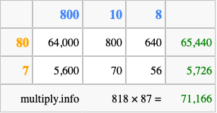 That's all there is to it! As you can see from the box above, the answer to 818 times 87 using the box method is 71,166.