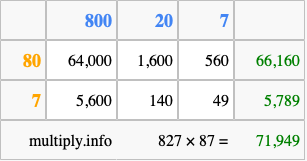 Finally, we add up all the sums we found in step 3 to get our final answer to 827 times 87.