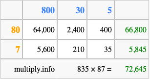 Finally, we add up all the sums we found in step 3 to get our final answer to 835 times 87.