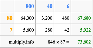Finally, we add up all the sums we found in step 3 to get our final answer to 846 times 87.