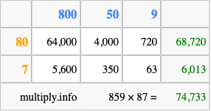 That's all there is to it! As you can see from the box above, the answer to 859 times 87 using the box method is 74,733.