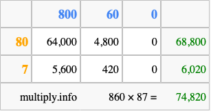 Finally, we add up all the sums we found in step 3 to get our final answer to 860 times 87.