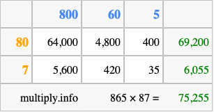 Finally, we add up all the sums we found in step 3 to get our final answer to 865 times 87.
