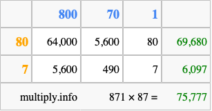 Finally, we add up all the sums we found in step 3 to get our final answer to 871 times 87.