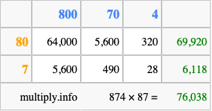 Finally, we add up all the sums we found in step 3 to get our final answer to 874 times 87.