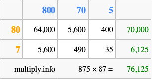 Finally, we add up all the sums we found in step 3 to get our final answer to 875 times 87.