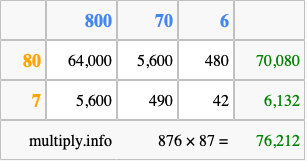 That's all there is to it! As you can see from the box above, the answer to 876 times 87 using the box method is 76,212.