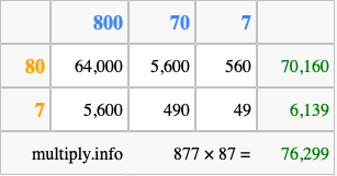 That's all there is to it! As you can see from the box above, the answer to 877 times 87 using the box method is 76,299.