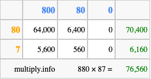 That's all there is to it! As you can see from the box above, the answer to 880 times 87 using the box method is 76,560.
