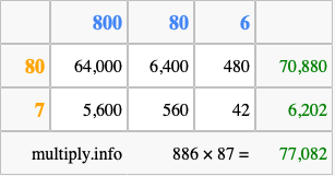 Finally, we add up all the sums we found in step 3 to get our final answer to 886 times 87.