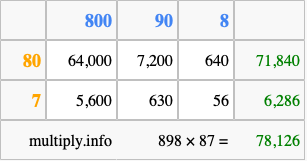 Finally, we add up all the sums we found in step 3 to get our final answer to 898 times 87.