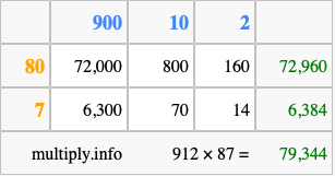 Finally, we add up all the sums we found in step 3 to get our final answer to 912 times 87.