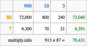 Below is an illustration showing you how to calculate 913 times 87 using the box method, using the instructions above.