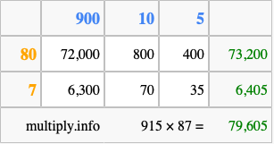 That's all there is to it! As you can see from the box above, the answer to 915 times 87 using the box method is 79,605.