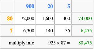 Finally, we add up all the sums we found in step 3 to get our final answer to 925 times 87.