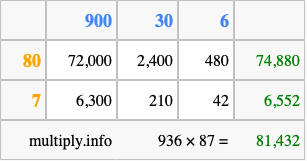 Finally, we add up all the sums we found in step 3 to get our final answer to 936 times 87.