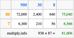 Finally, we add up all the sums we found in step 3 to get our final answer to 938 times 87.