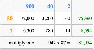 Finally, we add up all the sums we found in step 3 to get our final answer to 942 times 87.
