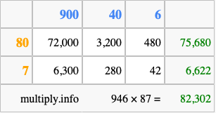 That's all there is to it! As you can see from the box above, the answer to 946 times 87 using the box method is 82,302.