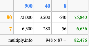 Finally, we add up all the sums we found in step 3 to get our final answer to 948 times 87.