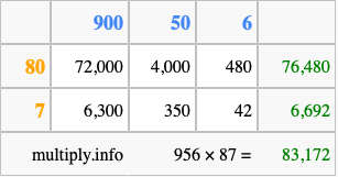 Finally, we add up all the sums we found in step 3 to get our final answer to 956 times 87.