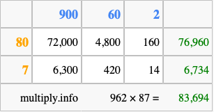 Finally, we add up all the sums we found in step 3 to get our final answer to 962 times 87.