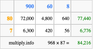Finally, we add up all the sums we found in step 3 to get our final answer to 968 times 87.