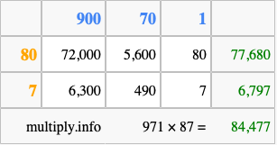 That's all there is to it! As you can see from the box above, the answer to 971 times 87 using the box method is 84,477.