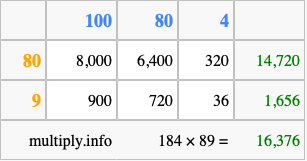 Finally, we add up all the sums we found in step 3 to get our final answer to 184 times 89.