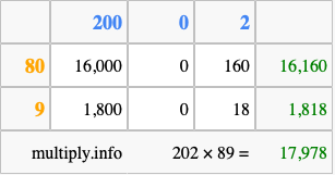 Finally, we add up all the sums we found in step 3 to get our final answer to 202 times 89.