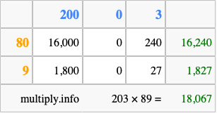 Finally, we add up all the sums we found in step 3 to get our final answer to 203 times 89.
