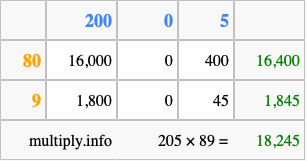 Finally, we add up all the sums we found in step 3 to get our final answer to 205 times 89.