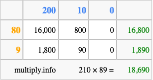 That's all there is to it! As you can see from the box above, the answer to 210 times 89 using the box method is 18,690.