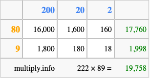 Finally, we add up all the sums we found in step 3 to get our final answer to 222 times 89.