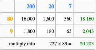 Finally, we add up all the sums we found in step 3 to get our final answer to 227 times 89.
