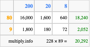 That's all there is to it! As you can see from the box above, the answer to 228 times 89 using the box method is 20,292.