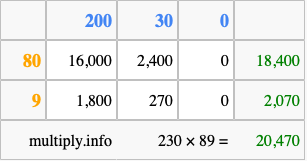 Finally, we add up all the sums we found in step 3 to get our final answer to 230 times 89.