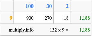 Below is an illustration showing you how to calculate 132 times 9 using the box method, using the instructions above.