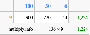 Below is an illustration showing you how to calculate 136 times 9 using the box method, using the instructions above.