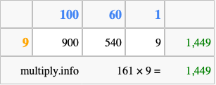 Below is an illustration showing you how to calculate 161 times 9 using the box method, using the instructions above.