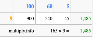 Below is an illustration showing you how to calculate 165 times 9 using the box method, using the instructions above.