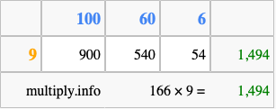 Below is an illustration showing you how to calculate 166 times 9 using the box method, using the instructions above.