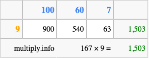 Below is an illustration showing you how to calculate 167 times 9 using the box method, using the instructions above.