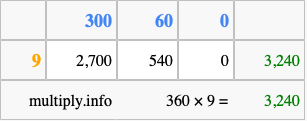 That's all there is to it! As you can see from the box above, the answer to 360 times 9 using the box method is 3,240.