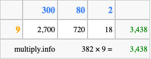 That's all there is to it! As you can see from the box above, the answer to 382 times 9 using the box method is 3,438.