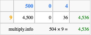 Below is an illustration showing you how to calculate 504 times 9 using the box method, using the instructions above.