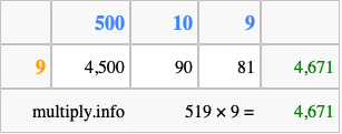 Below is an illustration showing you how to calculate 519 times 9 using the box method, using the instructions above.